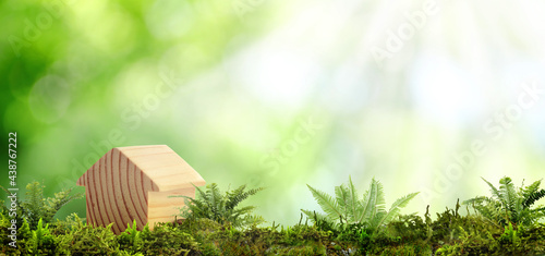 Eco friendly home. House model on green grass outdoors, banner design with space for text