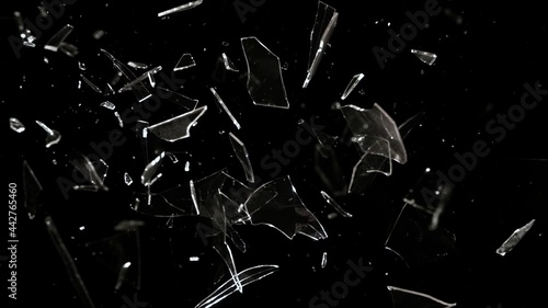 Studio full-frame wide plate shot of window glass pane shattering and breaking on black background. Real smash explosion at high speed as action concept template and overlay element.