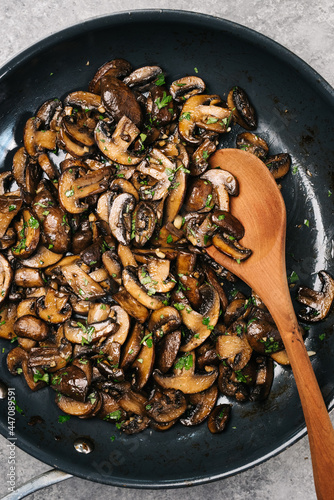 Sauteed Cremini mushrooms in a frying pan