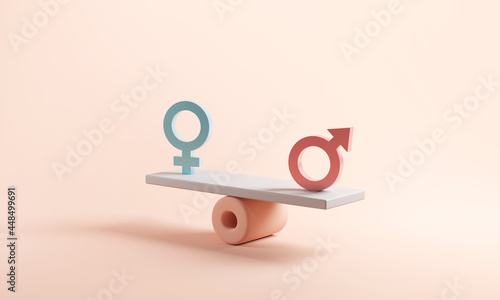 Gender equality concept. Male and female symbol on the scales with balance on blue background. minimal style, 3d render.