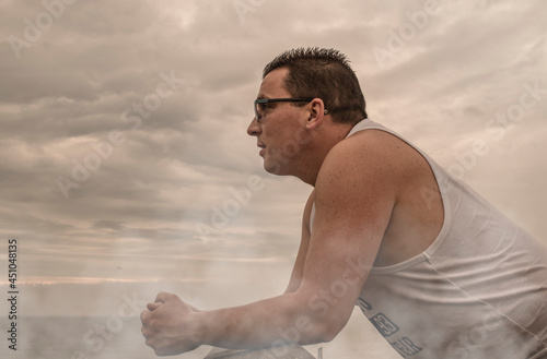 Człowiek rozmyślajacy nad dalszym zyciem na tle pochmurnego nieba.