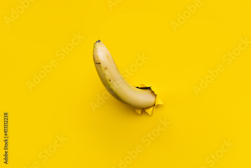 A large banana curved upward through a torn hole in yellow paper. The concept of tropical fruits, vegetarianism, good potency and erection. Background with copy space.