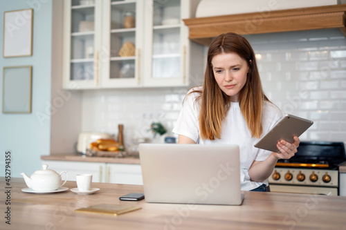 A woman sits at home and writes a message to a client by mail. He does his homework on the computer, is connected to the Internet. Student studying online through a social network.