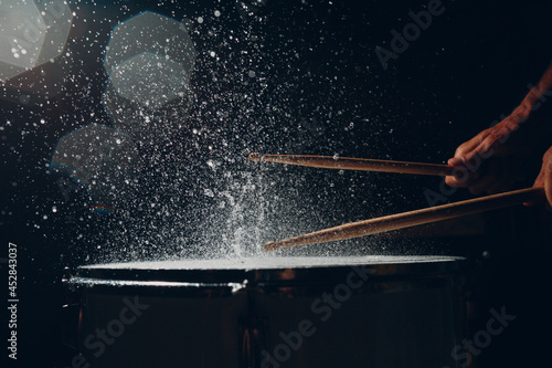 Close up drum sticks drumming hit beat rhythm on drum surface with splash water drops