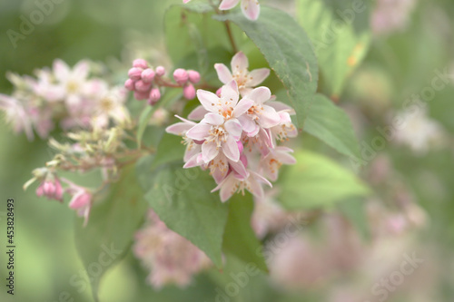 Rozkwitające letnie różowe kwiatuszki na krzewie, wiosenne tło florystyczne