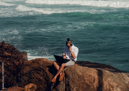 Cyfrowy nomada, człowiek pracujący z laptopem i smartfonem zdalnie na tle oceanu i skał siedzący na wybrzeżu.