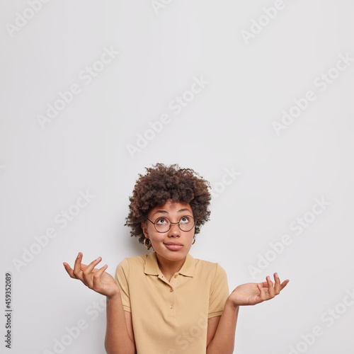 Indecisive hesitant curly young African American woman spreads palms feels doubtful focused above feels uncertainty while making decison wears casual beige t shirt isolated over white background