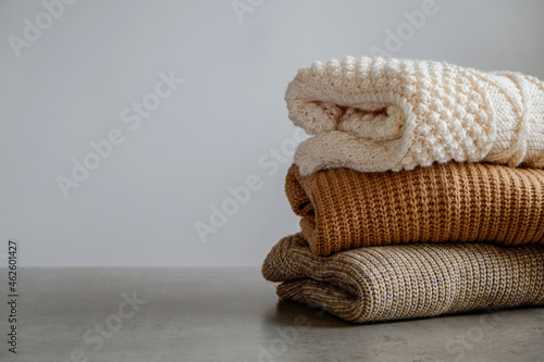 Bunch of knitted warm pastel color sweaters with different knitting patterns folded in stack, clearly visible texture. Stylish fall-winter season knitwear clothing. Close up, copy space for text.