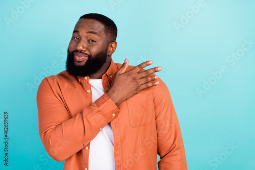 Photo of young handsome black man happy positive smile arrogant neat isolated over turquoise color background