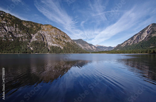 Alpiner Bergsee Heiterwanger See im morgendlichen Licht an einem kalten Tag im Herbst mit leicht bewölktem Himmel in Tirol, Österreich