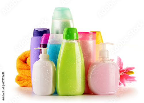 Plastic bottles of body care and beauty products