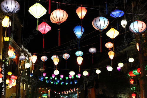 Kolorowe lampiony wiszące nad ulicą nocą, tworząc festiwalową atmosferę.