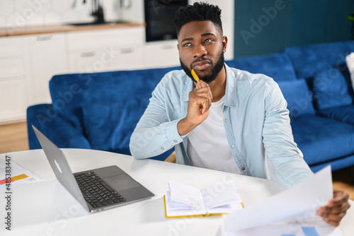 Intelligent pensive businessman involved virtual meeting on the laptop while sitting in modern office. Confident modern businessman in casual wear holding educational course