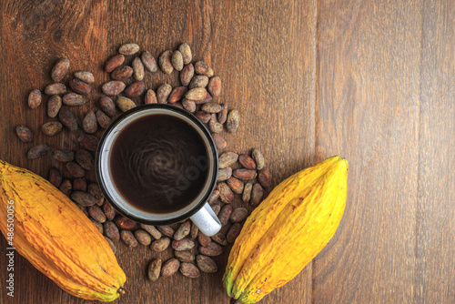 Hot cocoa drink or chocolate drink with cacao pod and cocoa beans on wooden table , top view