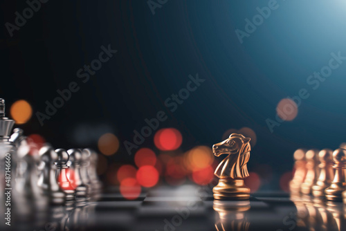 Golden chess knight is facing the silver opponent chess on black background. Leader, leadership, business strategy, challenge, brave or fearless concept.