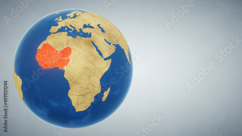 Earth globe with region of West Africa highlighted in red. 3D illustration. Elements of this image furnished by NASA