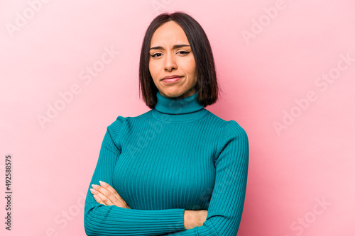 Young hispanic woman isolated on pink background unhappy looking in camera with sarcastic expression.