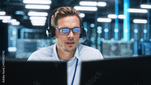 Portrait of a Young Caucasian Male Call Centre Worker Wearing a Phone Headset Talking at the Support Line with Serious Face in a Modern Open Plan Office at Night. Helpline Concept