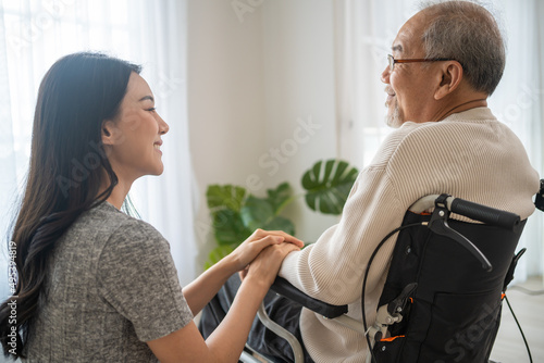 Asian daughter support old disabled man sitting on wheelchair at home.