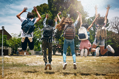 Schools out. Rearview shot of a group of unidentifiable schoolchildren jumping in the park.