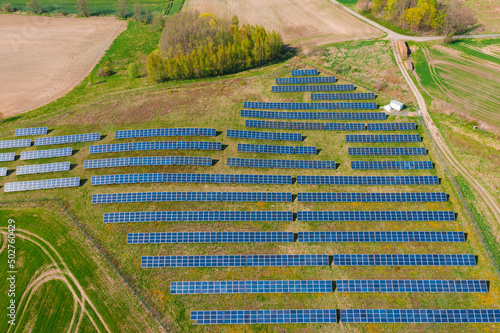 Panele słoneczne na zboczu wzgórza porośniętego zieloną, oświetlone blaskiem słońca. Widok z drona.