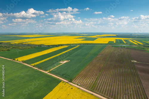 Aerial view with the amazing geometry texture landscape of a lot of agriculture fields with different plants like rapeseed and wheat. Farming industry.