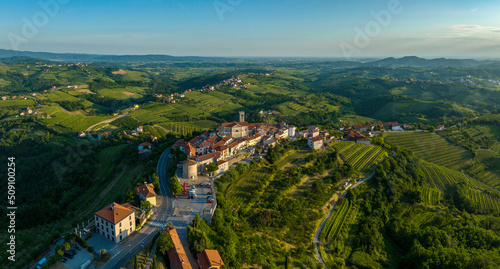 Fortified medieval village Smartno in Goriska Brda and landscape with vineyards, Slovenia