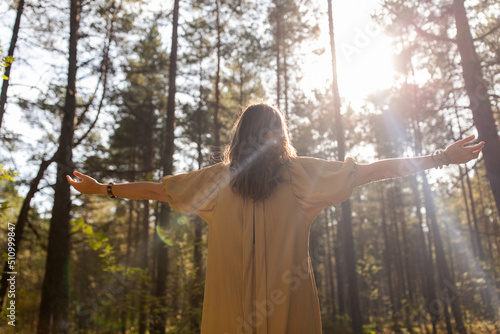 nature, spirituality and supernatural concept - young woman or witch performing magic ritual in forest