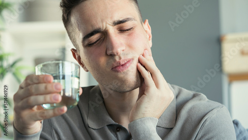Young man with sensitive teeth and hand holding glass of water