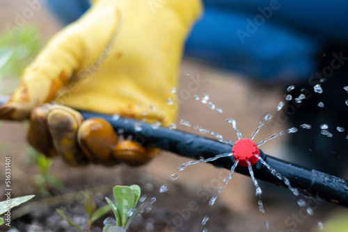 Close up view of hand holding a drip irrigation pipe while watering the vegetables in the process of growing