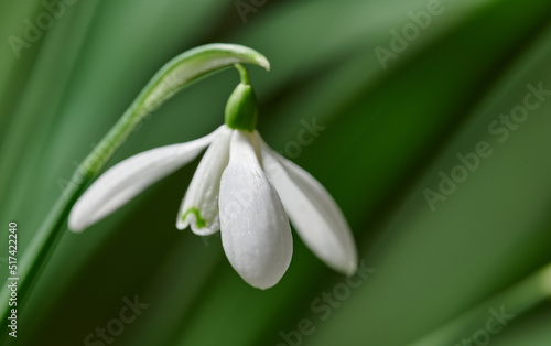 Closeup of a snowdrop flower against blurred nature background. Beautiful common white flowering plant or Galanthus Nivalis growing with petals, leaves and stem detail blooming in spring season