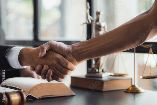 Lawyer and client shake hands, after winning a lawsuit where a lawyer hired by a client in a fraud case and proceeding in a fair and correct manner, the client wins the case. Fraud litigation concept.