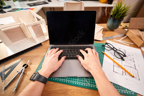 POV Shot Of Female Architect Working In Office On Plans For New Building Using Laptop