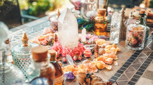 beautiful altar with crystals and rose flowers.