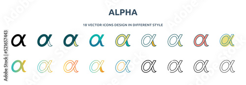 alpha icon in 18 different styles such as thin line, thick line, two color, glyph, colorful, lineal color, detailed, stroke and gradient. set of alpha vector for web, mobile, ui