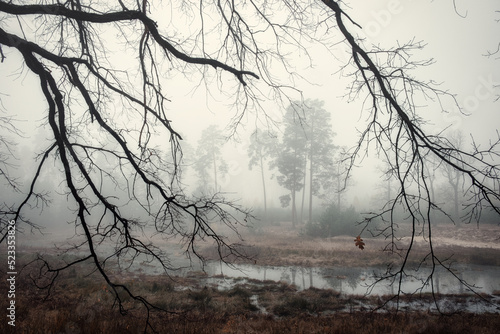 Beautiful atmospheric autumn foggy forest landscape. The last leaf on the bare branches of a tree on a rainy foggy day. Mysterious forest, autumn scene. Nature background. Atmospheric landscape