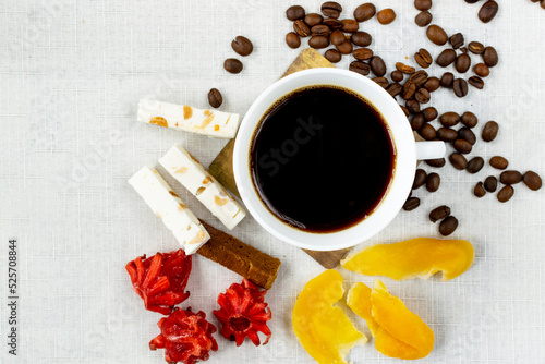 Popołudniowa czarna kawa w białej filiżance. Słodki deser.