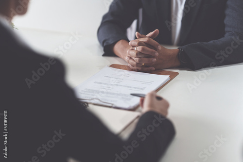 Business woman and lawyers discussing contract papers with brass scale on wooden desk in office. Law, legal services, advice, Justice concept
