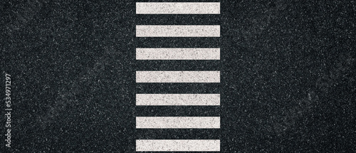 asphalt road with pedestrian crossing white lines. Dark gray textured surface. Banner design