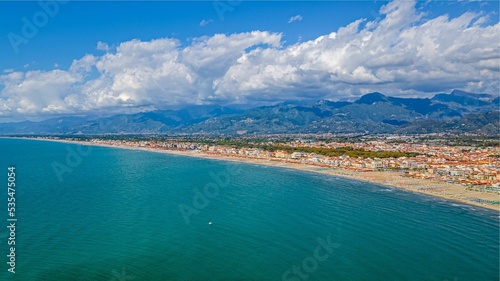 Aerial view of the beautiful sunny shore of Viareggio, Italy