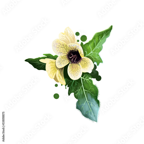 Khurasani ajwain - Hyoscyamus niger ayurvedic herb, blossom. digital art illustration with text isolated on white. Healthy organic spa plant used in treatment, preparation medicines for natural usages