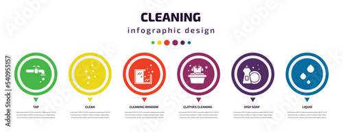 cleaning infographic element with icons and 6 step or option. cleaning icons such as tap, clean, cleaning window, clothes dish soap, liquid vector. can be used for banner, info graph, web,