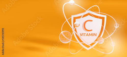 vitamin c, shield symbol, atoms orbiting on orange background, 3d rendering with copy space