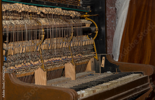 Stare , zabytkowe i zdewastowane pianino . Anatomia pianina - widoczna wewnętrzna budowa strunowego instrumentu .