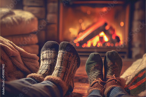 Couple resting by the Christmas fireplace. Winter and Christmas holidays concept.