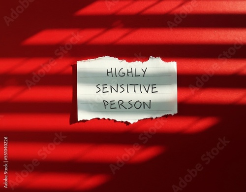 Torn note stick on red background with text HIGHLY SENSITIVE PERSON, refers to people who think and feel everything more deeply, more sensitive to the environment and social interactions