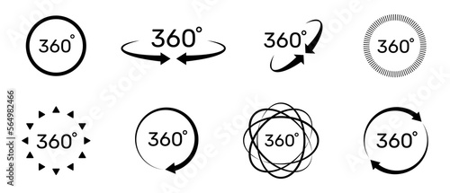 360 degree icon set. Symbol with arrow to indicate the rotation, virtual reality or panoramas to 360 degrees