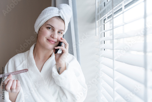 Portrait of smiling woman in bathrobe and towel turban talking on smart phone