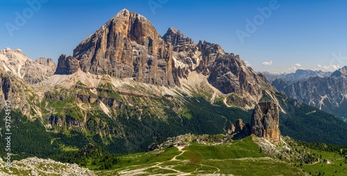 Great view of the top Tofana di Rozes and Cinque Torri range in Dolomites, South Tyrol. Location Cortina d'Ampezzo, Italy, Europe. Beauty of mountains world.