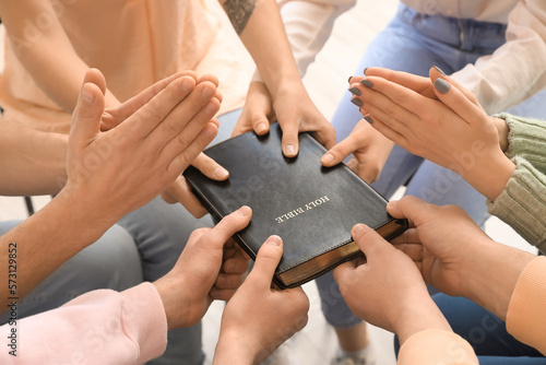 Group of people praying with Holy Bible in room, closeup